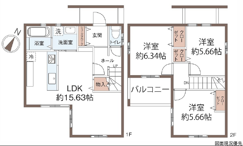 間取り:1F 約15.63LDK/2F 約6.34洋・約5.66洋・約5.66洋